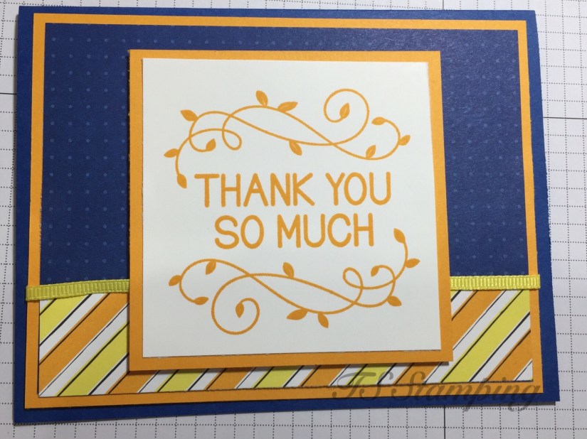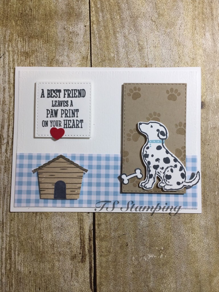 A second card I made with the same bundle used the same base, whisper white measuring at 8 1/2 by 5 1/2, folded in half at 4 1/4. I used another piece of whisper white, 5 1/4 by 4 and ran that through with the Subtles Dynamic Embossing folder ( item # 143706). I used a 1 by 5 1/2 piece of Gingham Gala paper (item # 148554). Next I stamped the dog, the house, and the greeting on a scrap piece of whisper white card stock. The crumb cake paper is cut out with the Rectangle Stiched Framelits, item number 148551. I stamped the paw prints with crumb cake ink. The greeting is cut out with the stitched shape framelit dies, item number 145372. I punch the dog with the dog punch and hand cut out the bone and dog house. Items are attached to the card with dimensional.