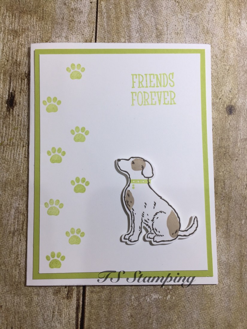 This card is made with an 8 1/2 by 5 1/2 piece of whisper white card stock. The lemon lime twist paper is 5 1/4 by 4 and the whisper white measures 5 by 3 3/4. I stamped the dog prints in lemon lime twist ink along with the greeting. The dog is stamped in Early Espresso ink, the spots I stamped with Crumb Cake. I punched out the dog with the punch included in the bundle.
